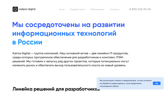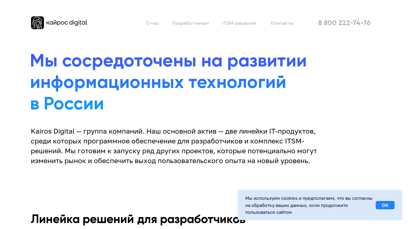 SEO-описаниеKairos Digital сосредоточен на запуске проектов с высоким потенциалом развития. Нашими активами являются две линейки IT-продуктов, которые включают в себя ПО для разработчиков и ряд ITSM-решений для корпоративной автоматизации.