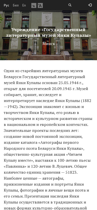 SEO-описание | Учреждение «Государственный литературный музей Янки Купалы» — новости и афиша мероприятий, информация для посетителей, цены, экспозиция, коллекции, материалы для музейщиков. |
