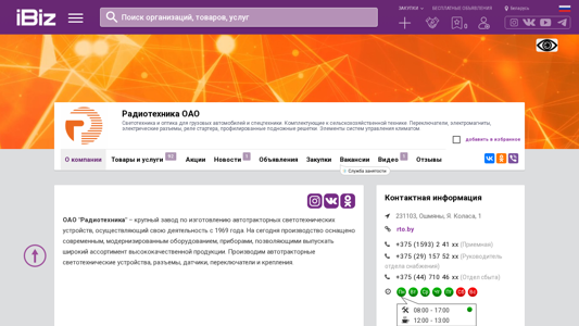 Название / Заголовок | Радиотехника ОАО - Светотехника и оптика для грузовых автомобилей и спецтехники. Комплектующие к сельскохозяйственной технике. Переключатели, электромагниты, электрические разъемы, реле стартера, профилированные подножные решетки. Элементы систем управления климатом.. 231103, Ошмяны, , Я. Коласа, 1 |