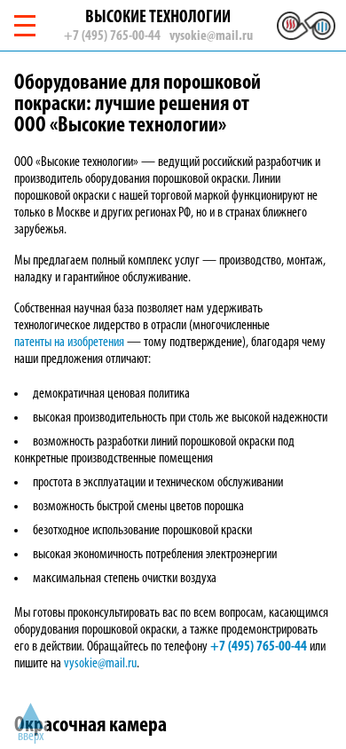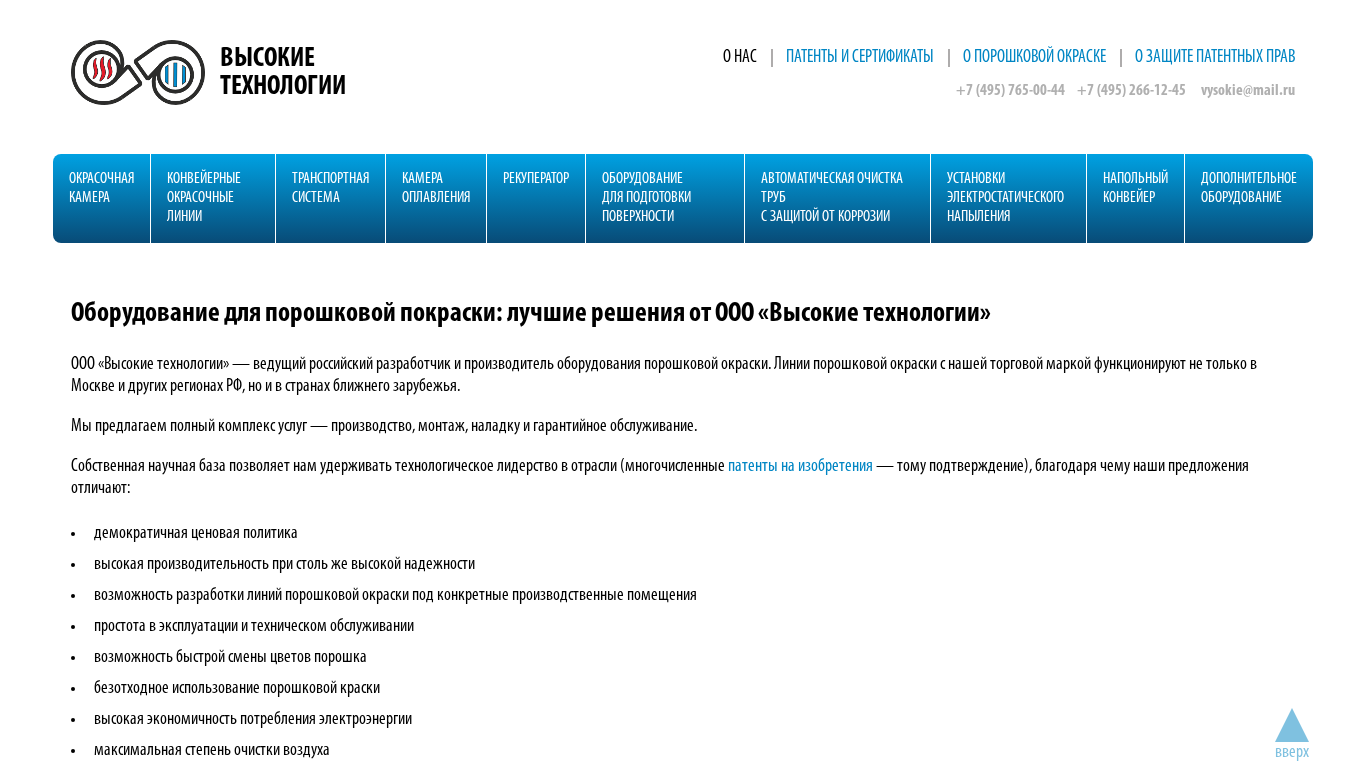 SEO-описание | ООО «Высокие технологии» — ведущий российский разработчик и производитель оборудования для порошковой окраски, технологический лидер отрасли с собственными запатентованными научными разработками. |