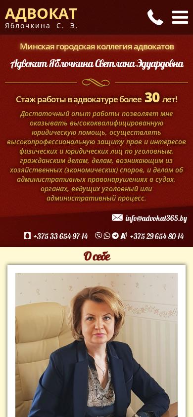 SEO-описание | Адвокат Яблочкина Светлана Эдуардовна. Юридические консультации, составление правовых документов, адвокат по уголовным, гражданским и экономическим делам. Стаж более 22 лет. |