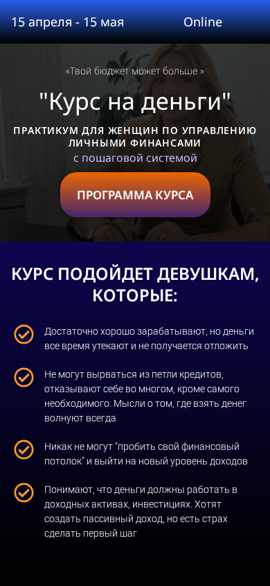 SEO-описание | «Твой бюджет может больше » "Курс на деньги" Практикум для женщин по управлению личными финансами с пошаговой системой Программа курса Курс подойдет девушкам, которые: Достаточно хорошо зарабатывают, но деньги все время утекают и не получается отложить Не могут вырваться из петли кредитов, отказывают себе во многом, кроме самого необходимого. Мысли о том, где взять денег |