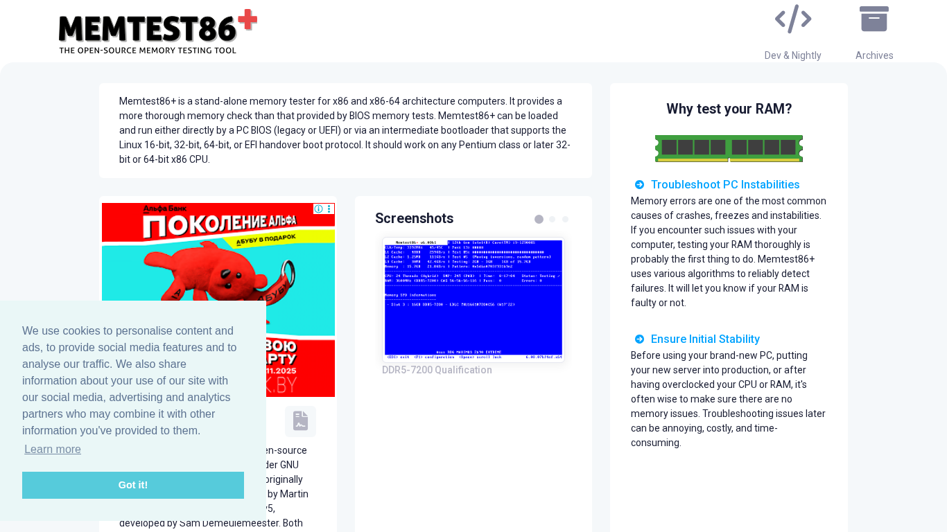 SEO-описание | Memtest86+ is an advanced, free, open-source, stand-alone memory tester for 32- and 64-bits architecture computers. Compatible with BIOS & UEFI. |
