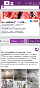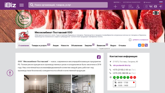 Название / Заголовок | Мясокомбинат Поставский ООО - Убой крупного рогатого скота. Туши и полутуши баранины и говядины. Производство и продажа полуфабрикатов натуральных мясных из говядины и баранины. Производство кожевенного сырья и субпродуктов. Соответствие продукции Сертификату Халяль.. 211875, Поставы, , Гагарина, 80 |