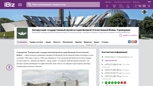 Название / Заголовок | Белорусский государственный музей истории Великой Отечественной Войны Учреждение - Крупнейшее в Беларуси хранилище реликвий Великой Отечественной войны. Проведение обзорных и тематических экскурсий по всем разделам ВОВ.. 220004, Минск, Победителей пр-т, 8 |