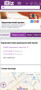 Название / Заголовок | Барановичский краеведческий музей - Тематические, пешеходные экскурсии. Музейно-педагогические занятия, квесты, экскурсии-анимации.. 225409, Барановичи, , Советская, 72 |