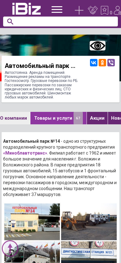 Название / Заголовок | Автомобильный парк №14 Филиал ОАО Миноблавтотранс - Автостоянка. Аренда помещений. Размещение рекламы на транспорте. Гостехосмотр. Грузовые перевозки по РБ. Пассажирские перевозки по заказам юридических и физических лиц. СТО грузовых автомобилей. Шиномонтаж любых марок автомобилей.. 222357, Воложин, , Транспортная, 2 |