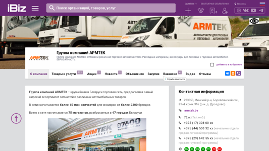 Название / Заголовок | Группа компаний АРМТЕК - Группа компаний ARMTEK. Оптовая и розничная торговля автозапчастями. Расходные материалы, аксессуары для легковых и грузовых автомобилей. ЕВРОЗАПЧАСТЬ. . 223053, , Боровлянский с/с , 81-4, комн. 316 (р-н. д. Дроздово) |