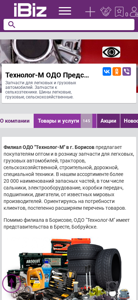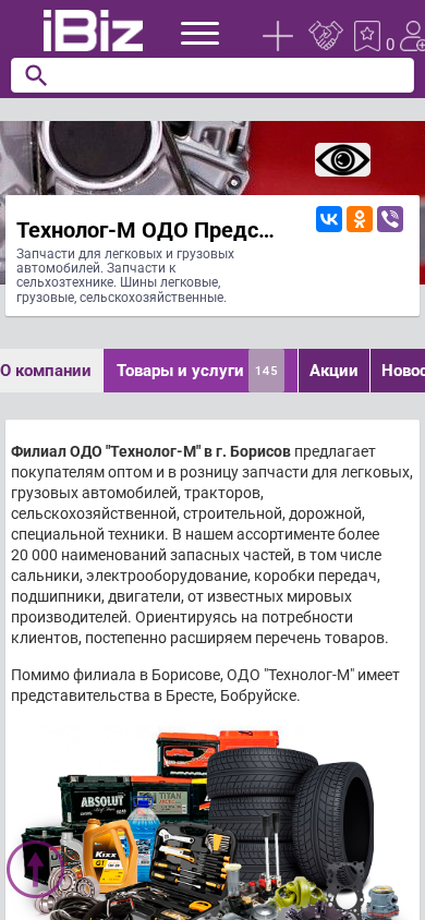AI-анализ | The portal Technolog-M ODO Representative Office in Borisov is a retailer of spare parts for light and heavy automobiles, as well as spare parts for agricultural and construction machinery. It offers light, heavy, and agricultural tires. The company is located in Borisov at Demina 5, and its contact information and map are provided on the website. Their product range includes over 20,000 items, such as engine parts, electrical components, transmission boxes, bearings, engines, and filters from well-known international manufacturers. The company aims to expand its offerings based on customer demand and has representative offices in Brest and Bobruisk as well. The Borisov branch currently sells spare parts for passenger cars, spare parts for heavy trucks, spare parts for tractors, spare parts for municipal equipment, and agricultural machinery. They also offer automotive chemicals, tires, bearings, and |