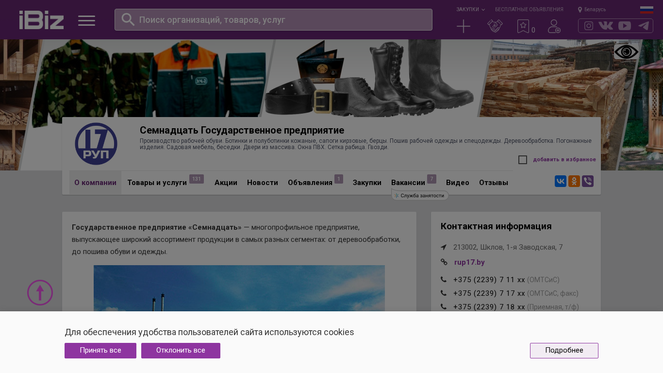 favicon Семнадцать Государственное предприятие - Производство рабочей обуви. Ботинки и полуботинки кожаные, сапоги кирзовые, берцы. Пошив рабочей одежды и спецодежды. Деревообработка. Погонажные изделия. Садовая мебель, беседки. Двери из массива. Окна ПВХ. Сетка рабица. Гвозди.. 213002, Шклов, , 1-я Заводская, 7
