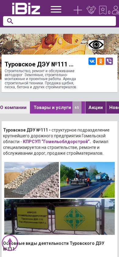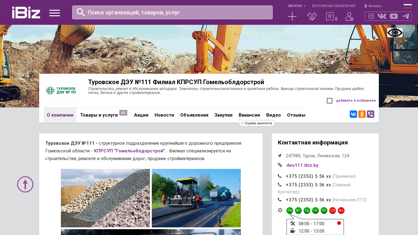 | Название / Заголовок | Туровское ДЭУ №111 Филиал КПРСУП Гомельоблдорстрой - Строительство, ремонт и обслуживание автодорог. Земляные, строительно-монтажные и проектные работы. Аренда строительной техники. Продажа щебня, песка, бетона и других стройматериалов.. 247980, Туров, , Ленинская, 124 |