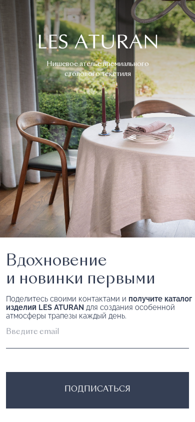 | AI-анализ | --- This website, titled "LES ATURAN," is a premium table linen atelier. The description specifies that it is a niche studio. Keywords associated with this website include "les," "aturan," "обязательное поле" (obligatory field), "поле укажите, пожалуйста" (please indicate the field), "корректный email" (correct email), and "подписаться" (subscribe). The website prompts users to enter a correct email address twice in order to subscribe. The text also mentions "вдохновение и новинки первыми" (inspiration and novelties first), suggesting that the website offers the latest trends. The website's language is in Cyrillic and appears to be based on the Tilda platform. The main focus of the website is to create a |
