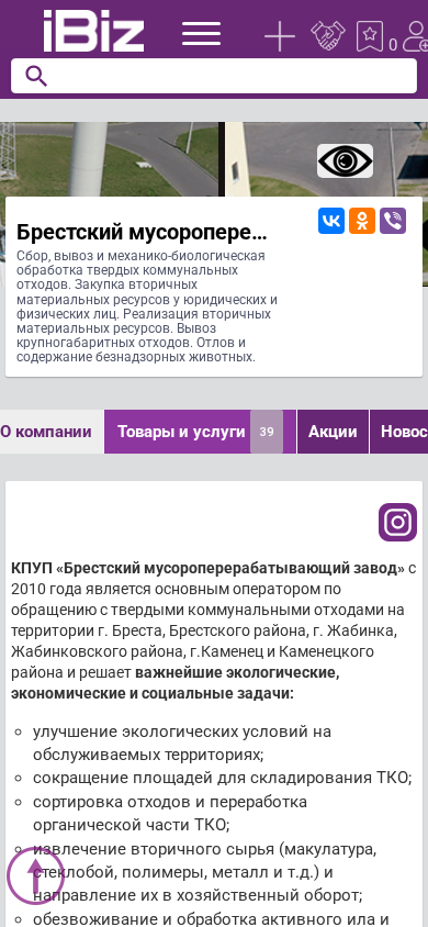 Название / Заголовок | Брестский мусороперерабатывающий завод Коммунальное производственное унитарное предприятие - Сбор, вывоз и механико-биологическая обработка твердых коммунальных отходов. Закупка вторичных материальных ресурсов у юридических и физических лиц. Реализация вторичных материальных ресурсов. Вывоз крупногабаритных отходов. Отлов и содержание безнадзорных животных.. 224008, Брест, , Ковельская, 1 |