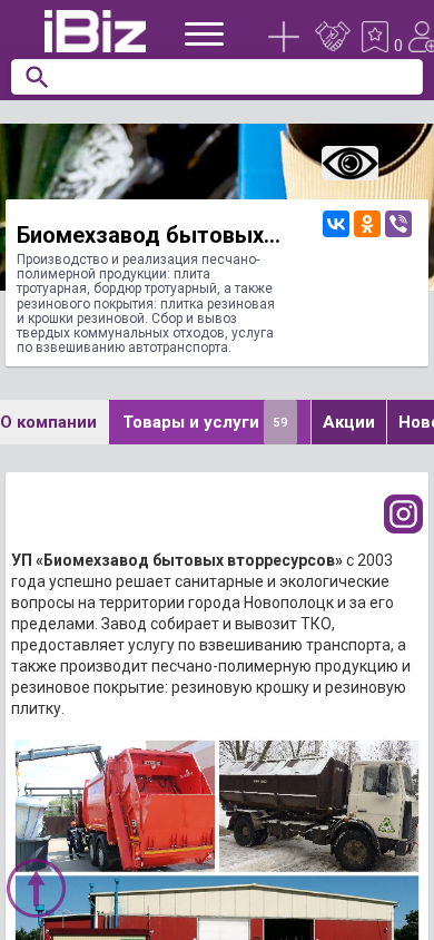| Название / Заголовок | Биомехзавод бытовых вторресурсов УП - Производство и реализация песчано-полимерной продукции: плита тротуарная, бордюр тротуарный, а также резинового покрытия: плитка резиновая и крошки резиновой. Сбор и вывоз твердых коммунальных отходов, услуга по взвешиванию автотранспорта.. 211440, Новополоцк, , Техническая, 5 |