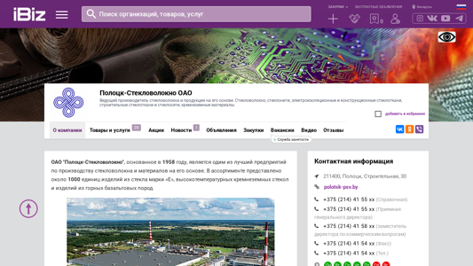 Название / Заголовок | Полоцк-Стекловолокно ОАО - Ведущий производитель стекловолокна и продукции на его основе. Стекловолокно, стеклонити, электроизоляционные и конструкционные стеклоткани, строительные стеклоткани и стеклосети, кремнеземные материалы.. 211400, Полоцк, , Строительная, 30 |