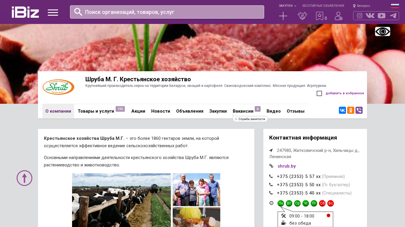 Название / Заголовок | Шруба М. Г. Крестьянское хозяйство - Крупнейший производитель зерна на территории Беларуси, овощей и картофеля. Свиноводческий комплекс. Мясная продукция. Агротуризм. . 247980, , Хильчицы д., Ленинская |