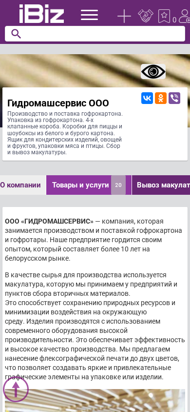 Название / Заголовок | Гидромашсервис ООО - Производство и поставка гофрокартона. Упаковка из гофрокартона. 4-х клапанные короба. Коробки для пиццы и шоубоксы из белого и бурого картона. Ящик для кондитерских изделий, овощей и фруктов, упаковки мяса и птицы. Сбор и вывоз макулатуры.. 222750, Фаниполь, , Заводская, 35 |