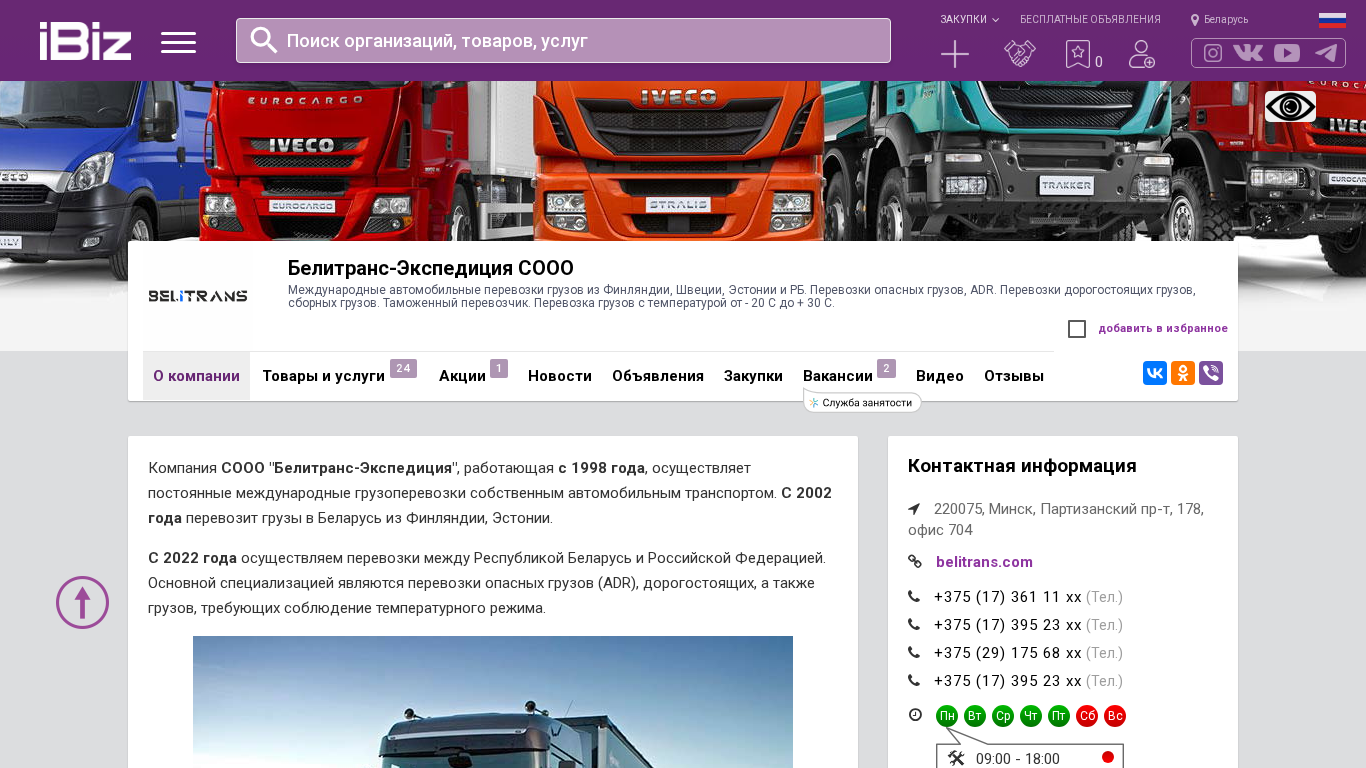Название / Заголовок | Белитранс-Экспедиция СООО - Международные автомобильные перевозки грузов из Финляндии, Швеции, Эстонии и РБ. Перевозки опасных грузов, ADR. Перевозки дорогостоящих грузов, сборных грузов. Таможенный перевозчик. Перевозка грузов с температурой от - 20 С до + 30 С.. 220075, Минск, , Партизанский пр-т, 178, офис 704 |
