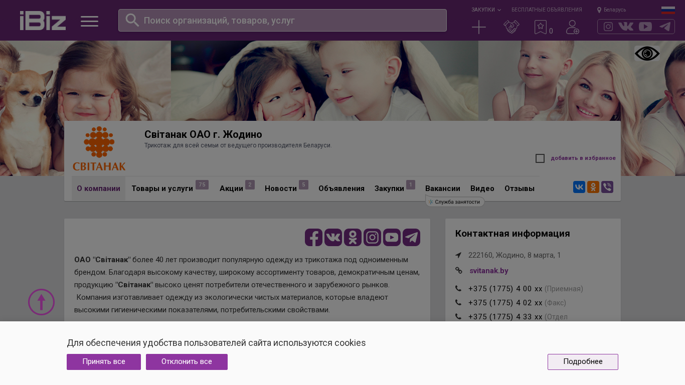 Название / Заголовок | Свiтанак ОАО г. Жодино - Трикотаж для всей семьи от ведущего производителя Беларуси.. 222160, Жодино, , 8 марта, 1 |