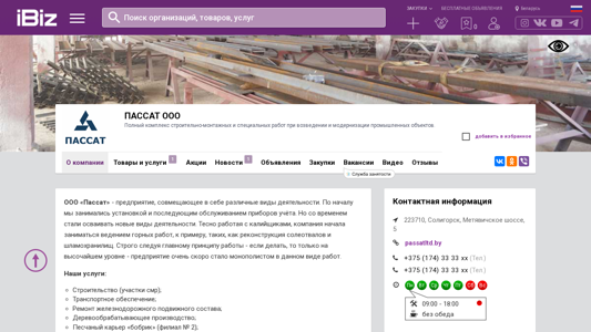 Название / Заголовок | ПАССАТ ООО - Полный комплекс строительно-монтажных и специальных работ при возведении и модернизации промышленных объектов.. 223710, Солигорск, , Метявичское шоссе, 5 |