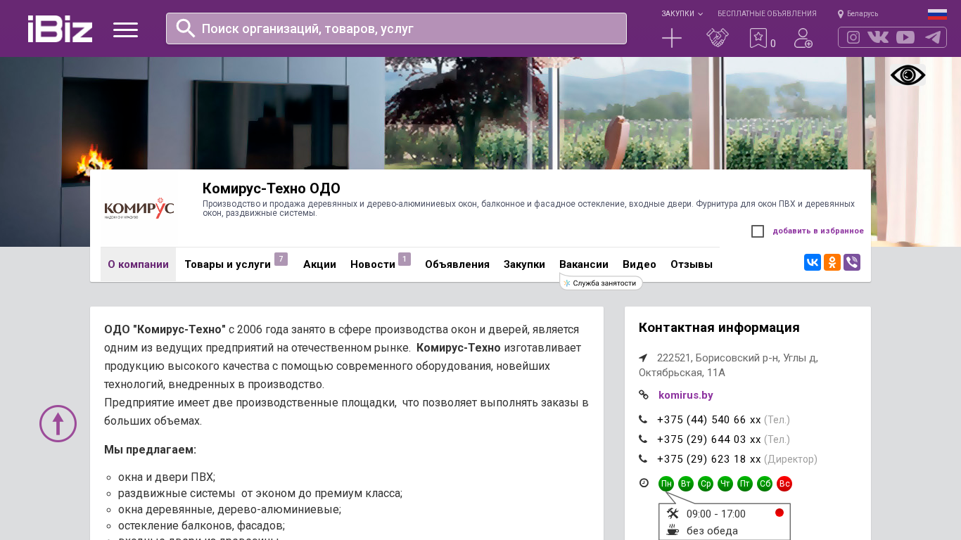 | Название / Заголовок | Комирус-Техно ОДО - Производство и продажа деревянных и дерево-алюминиевых окон, балконное и фасадное остекление, входные двери. Фурнитура для окон ПВХ и деревянных окон, раздвижные системы.. 222521, , Углы д, Октябрьская, 11А |