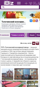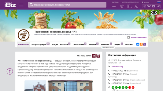 Название / Заголовок | Толочинский консервный завод РУП - Реализация: картофель, яблоки, соковая продукция. Вино фруктово-ягодное натуральное, крахмал картофельный. Розничная и оптовая продукция.. 211072, , Озерцы аг., Школьная, 16А |