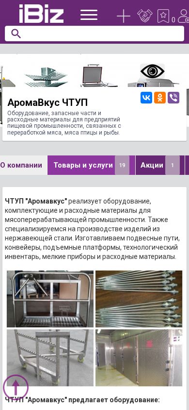Название / Заголовок | АромаВкус ЧТУП - Оборудование, запасные части и расходные материалы для предприятий пищевой промышленности, связанных с переработкой мяса, мяса птицы и рыбы.. 231513, Щучин, , 17 сентября, 46 |