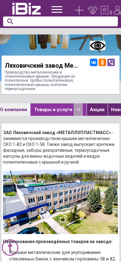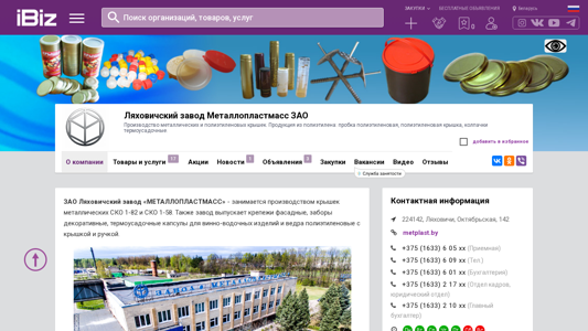Название / Заголовок | Ляховичский завод Металлопластмасс ЗАО - Производство металлических и полиэтиленовых крышек. Продукция из полиэтилена: пробка полиэтиленовая, полиэтиленовая крышка, колпачки термоусадочные.. 224142, Ляховичи, , Октябрьская, 142 |