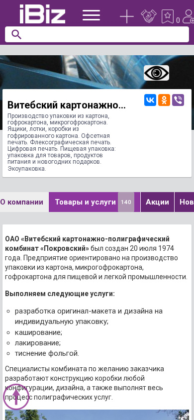 Название / Заголовок | Витебский картонажно-полиграфический комбинат Покровский ОАО - Производство упаковки из картона, гофрокартона, микрогофрокартона. Ящики, лотки, коробки из гофрированного картона. Офсетная печать. Флексографическая печать. Цифровая печать. Пищевая упаковка: упаковка для товаров, продуктов питания и новогодних подарков. Экоупаковка.. 210001, Витебск, , Покровская, 5 |