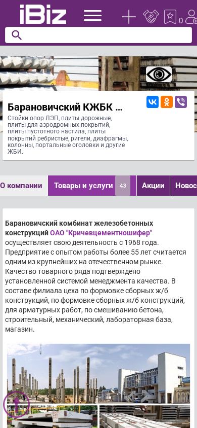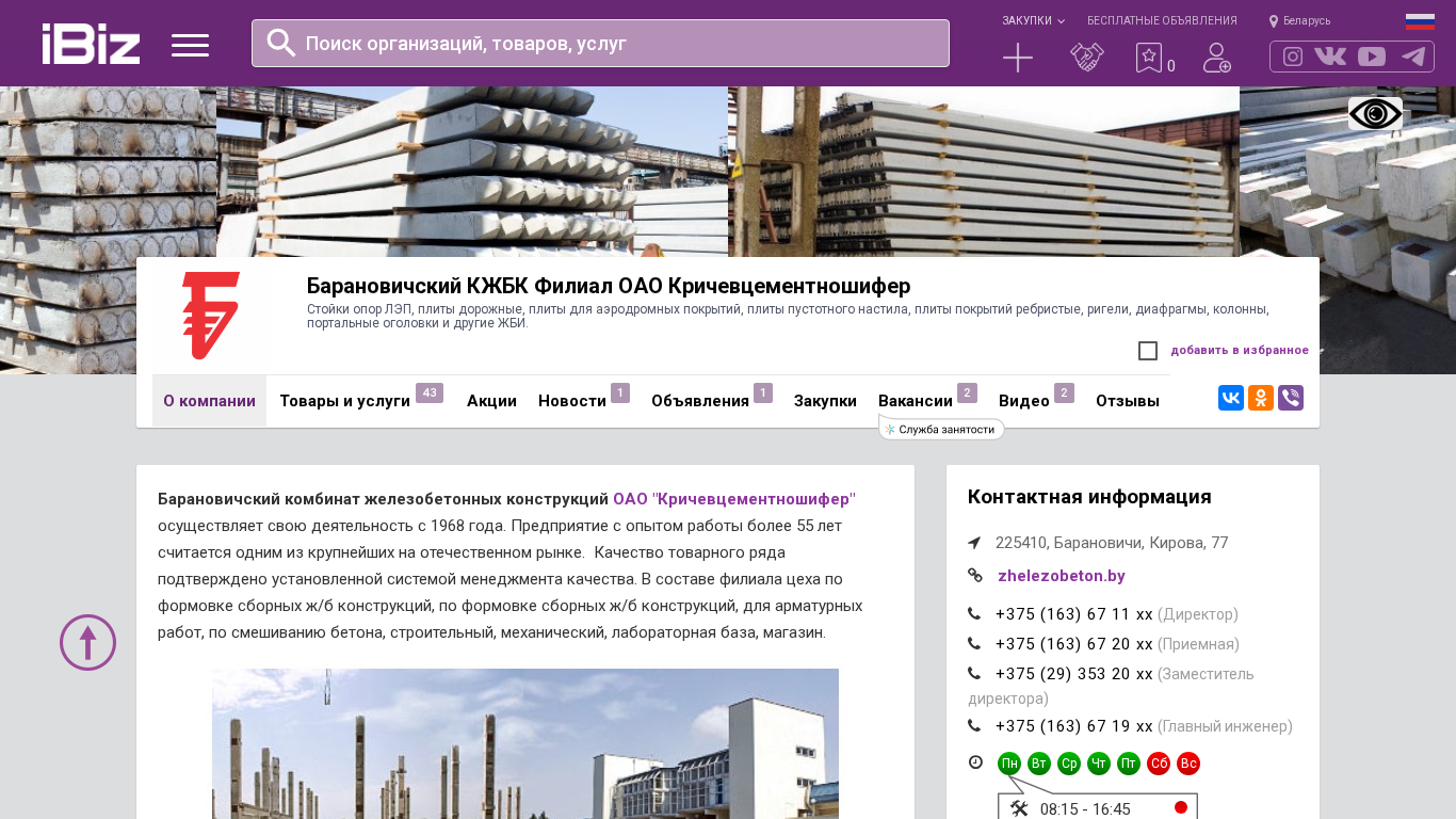 Название / ЗаголовокБарановичский КЖБК Филиал ОАО Кричевцементношифер - Стойки опор ЛЭП, плиты дорожные, плиты для аэродромных покрытий, плиты пустотного настила, плиты покрытий ребристые, ригели, диафрагмы, колонны, портальные оголовки и другие ЖБИ.. 225410, Барановичи, , Кирова, 77