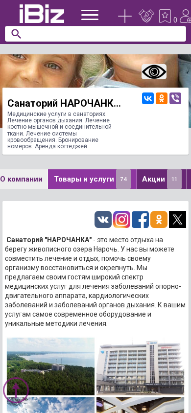 Название / Заголовок | Санаторий НАРОЧАНКА Дочернее унитарное предприятие - Медицинские услуги в санаториях. Лечение органов дыхания. Лечение костно-мышечной и соединительной ткани. Лечение системы кровообращения. Бронирование номеров. Аренда коттеджей. 222395, Нарочь, , Туристская, 12А |