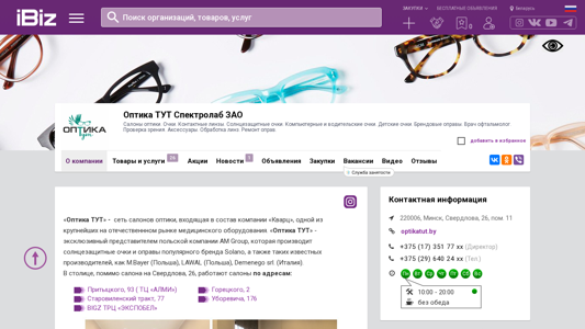 SEO-описание | Оптика ТУТ Спектролаб ЗАО - Салоны оптики. Очки. Контактные линзы. Солнцезащитные очки. Компьютерные и водительские очки. Детские очки. Брендовые оправы. Врач офтальмолог. Проверка зрения. Аксессуары. Обработка линз. Ремонт оправ.. Схема проезда, контактные телефоны, адрес компании Оптика ТУТ Спектролаб ЗАО. 220006, Минск, , Свердлова, 26, пом. 11 |