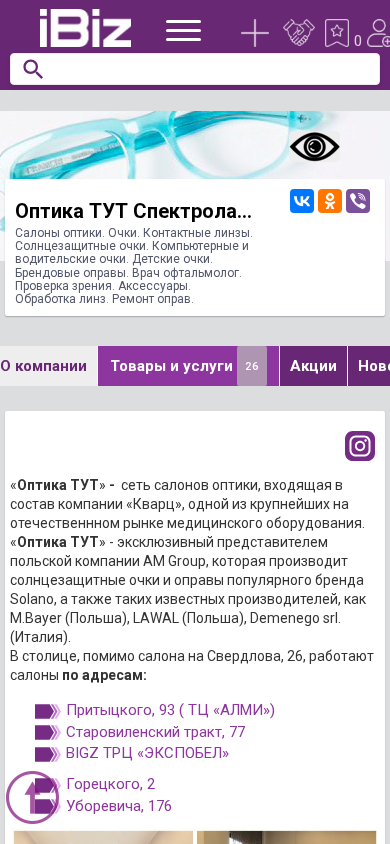 Название / Заголовок | Оптика ТУТ Спектролаб ЗАО - Салоны оптики. Очки. Контактные линзы. Солнцезащитные очки. Компьютерные и водительские очки. Детские очки. Брендовые оправы. Врач офтальмолог. Проверка зрения. Аксессуары. Обработка линз. Ремонт оправ.. 220006, Минск, , Свердлова, 26, пом. 11 |