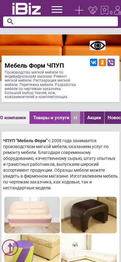 Название / Заголовок | Мебель Форм ЧПУП - Производство мягкой мебели по индивидуальным заказам. Ремонт мягкой мебели. Реставрация мягкой мебели. Перетяжка мебели. Разработка мебели по чертежам заказчика. Большой выбор тканей, кож, кожзаменителей и комплектующих.. 224000, Брест, , Я. Купалы, 104Д-2 |