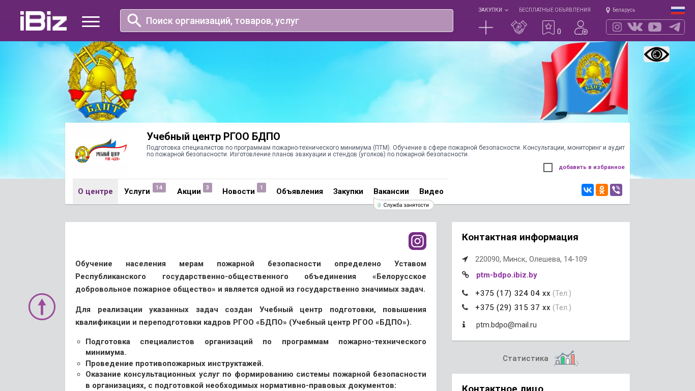 Название / ЗаголовокУчебный центр РГОО БДПО - Подготовка специалистов по программам пожарно-технического минимума (ПТМ). Обучение в сфере пожарной безопасности. Консультации, мониторинг и аудит по пожарной безопасности. Изготовление планов эвакуации и стендов (уголков) по пожарной безопасности.. 220090, Минск, , Олешева, 14-109