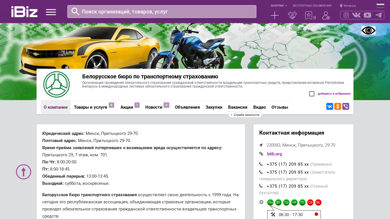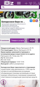 Название / Заголовок | Белорусское бюро по транспортному страхованию - Организация проведения обязательного страхования гражданской ответственности владельцев транспортных средств, представление интересов Республики Беларусь в международных системах обязательного страхования гражданской ответственности.. 220092, Минск, , Притыцкого, 29-70 |