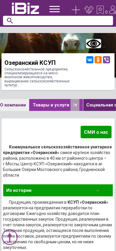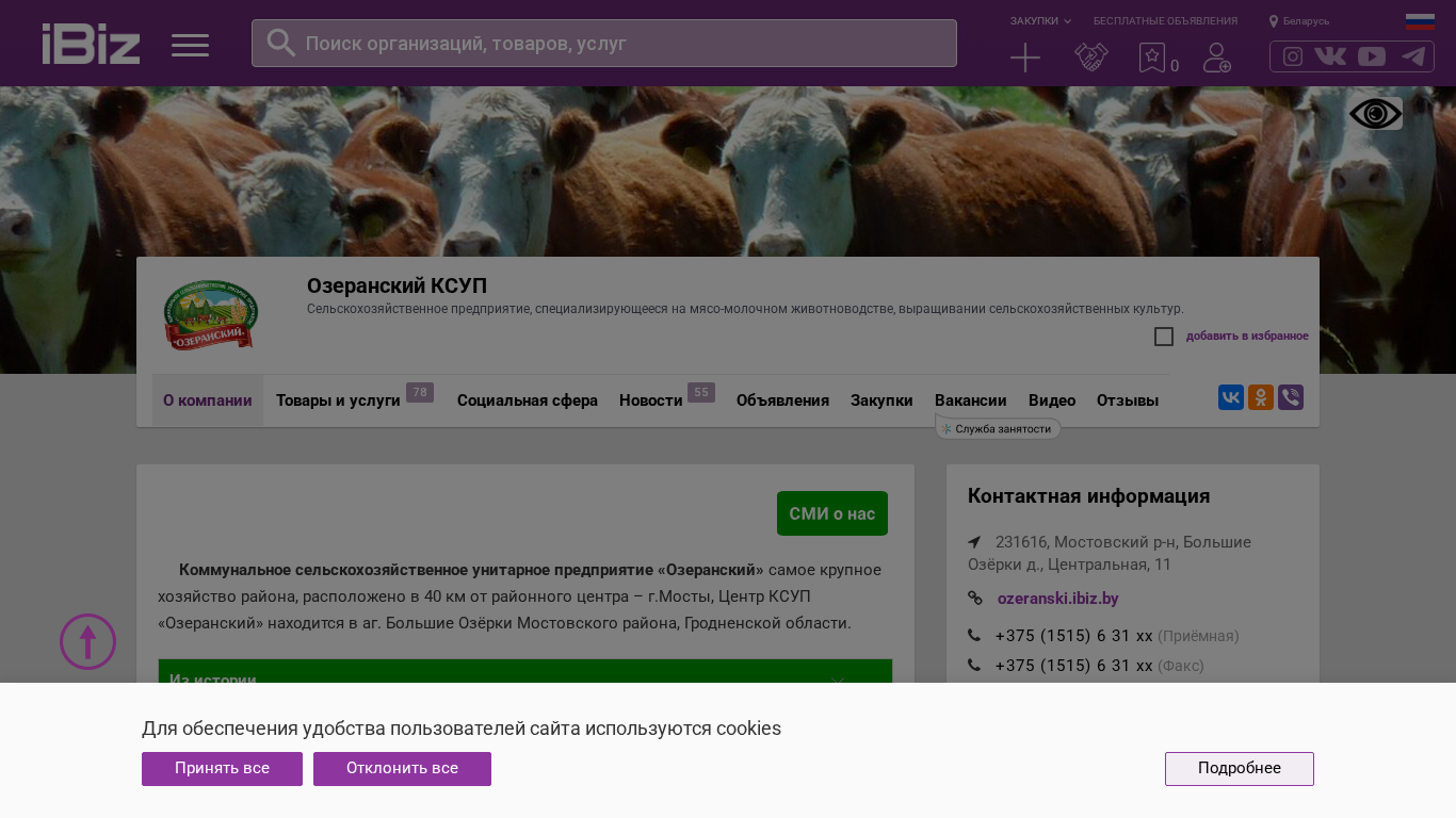 Название / Заголовок | Озеранский КСУП - Сельскохозяйственное предприятие, специализирующееся на мясо-молочном животноводстве, выращивании сельскохозяйственных культур.. 231616, , Большие Озёрки д., Центральная, 11 |