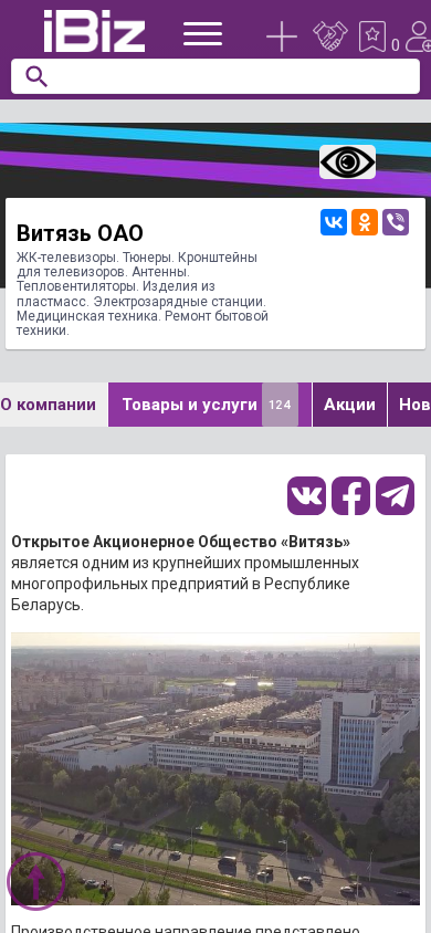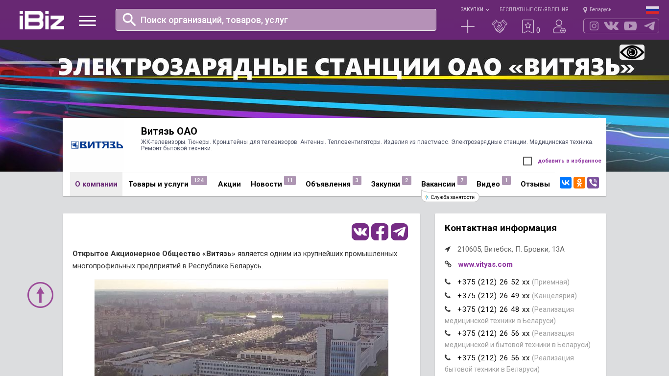 Название / Заголовок | Витязь ОАО - ЖК-телевизоры. Тюнеры. Кронштейны для телевизоров. Антенны. Тепловентиляторы. Изделия из пластмасс. Электрозарядные станции. Медицинская техника. Ремонт бытовой техники.. 210605, Витебск, , П. Бровки, 13А |