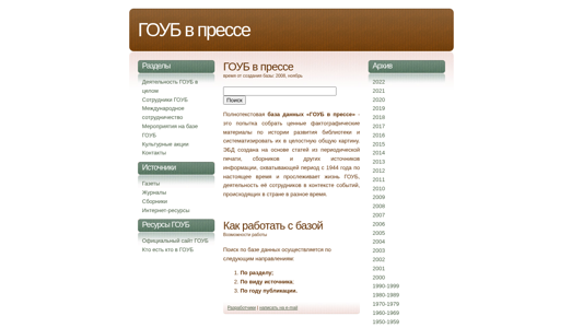 SEO-описание | База данных ГОУБ в прессе создана на основе статей из периодической печати, сборников и других источников информации, прослеживает жизнь ГОУБ, деятельность её сотрудников в контексте событий, происходящих в стране в разное время. |
