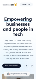 | AI-анализ | language: EN  The portal "fractionalcto.rocks" is a professional website of Yahor Kuryanovich, a fractional CTO providing technology consulting services. The title of the website is "Yahor Kuryanovich - your friendly neighborhood fractional CTO." The description indicates that Yahor is a passionate developer, entrepreneur, and technology enthusiast who has worked with numerous startups to help them develop their ideas into successful businesses. The website offers technology advice, assistance with project stack and architecture, team building, and engineering processes. Visitors can book a call with Yahor to discuss their needs. The domain is registered in the .ROCKS top-level domain and is written in English. |