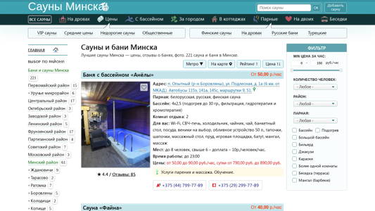 SEO-описание | Бани и сауны Минска: фото, контакты, ✓ 3326 отзывов о саунах. ✓ Цены от 7,00 р./час. ✓ 221 сауна и баня в Минске — финские сауны, русские бани, турецкие, японские. Лучшие бани осенью 2025 года. |