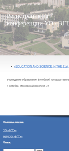 | AI-анализ | The website is for registering participation in a conference hosted by the Vitsebsk State Technological University (VGTPU) in Belarus. The conference, titled "Education and Science in the 21st Century," is scheduled for 2025. The university's main page includes links for registration for participants from Belarus and other countries, as well as for teachers and students of VGTPU. The event is held at the university located in Vitsebsk on Moscow Prospekt 72. Useful links on the page include those for the university and its research institute. The website is owned by VGTPU and copyrighted in 2025. |