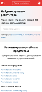 | AI-анализ | --- This online resource is a service for finding tutors throughout Russia. Rulesay.com helps users find tutors for individual or group lessons at an affordable price. Over 5,000 teachers provide instruction for children and adults both offline and online. Users can find tutors in popular subjects like English language, mathematics, physics, and chemistry. The service offers experienced teachers for exam preparation and improving knowledge in various school subjects, as well as for foreign languages and state exams like EGЭ and ОГЭ. Additionally, there are teachers for musical subjects and online lessons. Users can search for a tutor by subject, goal of lessons, and contacts in a free three-step process. The platform has an average rating of 4.9 based on 14,000 student reviews. |