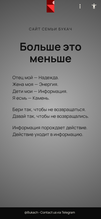 SEO-описание | Отец мой — Надежда. Жена моя — Энергия. Дети мои — Информация. Я есмь — Камень. Бери так, чтобы не возвращаться. Давай так, чтобы не возвращались. Информация порождает действие. Действие уходит в информацию. |