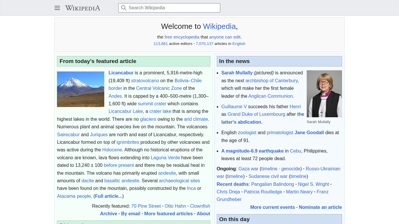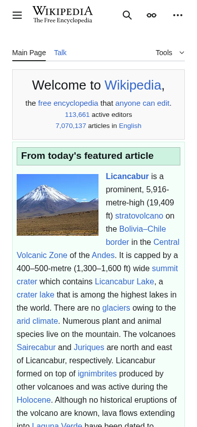 | AI-анализ | The web project "Wikipedia, the free encyclopedia" is an online, collaborative, multilingual encyclopedia that anyone can edit. It is written and maintained by volunteers, with 113,661 active editors and 7,070,137 articles in English alone. The website provides a vast array of information on various topics, with articles ranging from the well-known, such as Licancabur, a volcano on the Bolivia-Chile border, to the obscure. The site includes sections for featured articles, recent changes, and a search function. It also has a section for disclaimers and a welcome message for new users. Wikipedia is available in multiple languages, including English, and is funded through donations. |