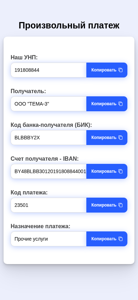 SEO-лексика | копировать код платежа оплата через интернет-банк произвольный платеж наш унп получатель банка-получателя бик счет получателя iban назначение |
