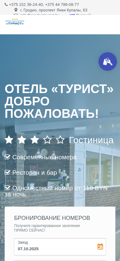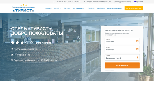 | AI-анализ | This website is for a hotel in Grodno, Belarus, named 'Tourist'. It offers various services including a restaurant, bar, conference hall, and tours. The title of the website is 'Гостиница Турист в Гродно' (Hotel Tourist in Grodno). The description mentions the hotel's location on Prospect Yanaki Kupala, number 63. The contact information provided includes phone numbers +375 152 39-24-40 and +375 44 786-08-77. The website also has information about various services and offers, such as 'Мотопутешественник' (Moto Traveler), 'Дары осени' (Autumn Gifts), and 'Только раз в году' (Once a Year). The website |