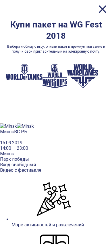 SEO-описание | Семейный праздник «WG Fest: День танкиста» пройдёт в Минске 15 сентября 2019 года в парке Победы. В программе: развлечения, розыгрыш призов, игровые зоны, фудкорты, салют, выступления любимых артистов. Вход свободный! |