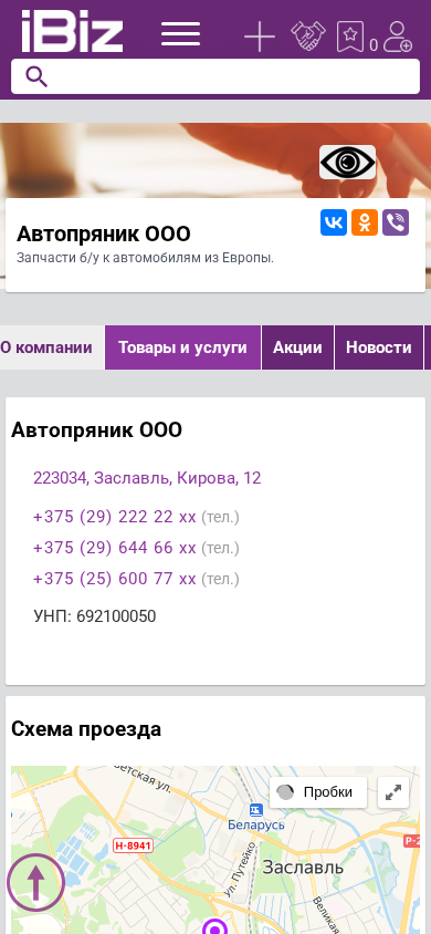 | AI-анализ | This website, titled "Автопряник ООО - Запчасти б/у к автомобилям из Европы," is a Belarusian business based in Заславль, Minsk Oblast. The company specializes in selling used auto parts from Europe. The website provides a map for visitors to locate the business address at 223034, Кирова, 12. The contact information includes three phone numbers: +375 (29) 222 22 xx, +375 (29) 644 66 xx, and +375 (25) 600 77 xx. The business hours are listed as Monday through Friday from 9:00 AM to 6:00 PM without lunch breaks. The website falls under the categories "Ав |