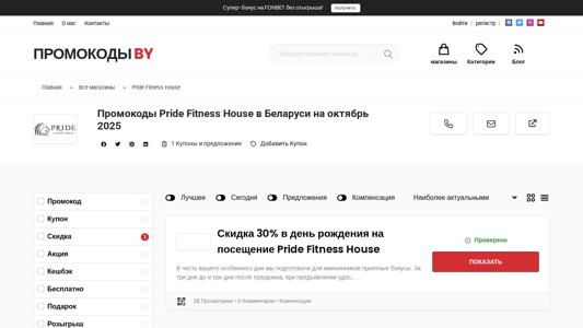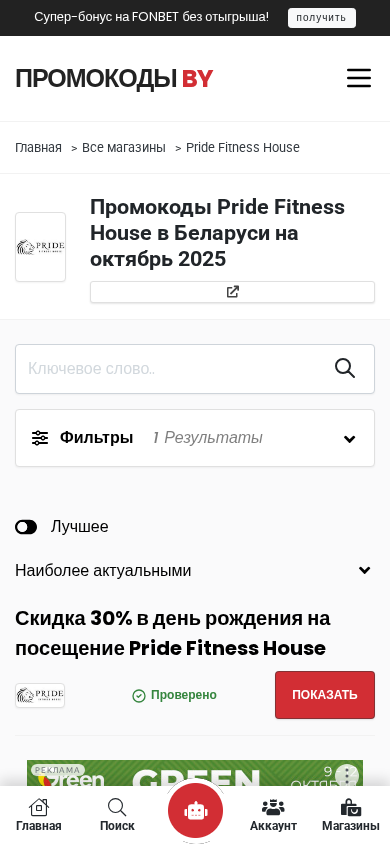 favicon Промокоды и скидки Pride Fitness House на октябрь 2025 | ПРОМОКОДЫ BY